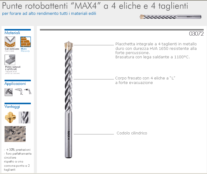 Punta rotobattente MAX 4 a 4 taglienti e 4 eliche per forare ad alto rendimento tutti i materiali edili