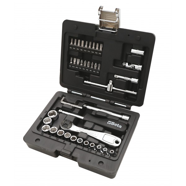 Valigetta con assortimento di chiavi a bussola da 1/4 con cricchetto, Beta 903E/C42, composta da 42 pezzi il tutto racchiuso in una pratica valigia in plastica.