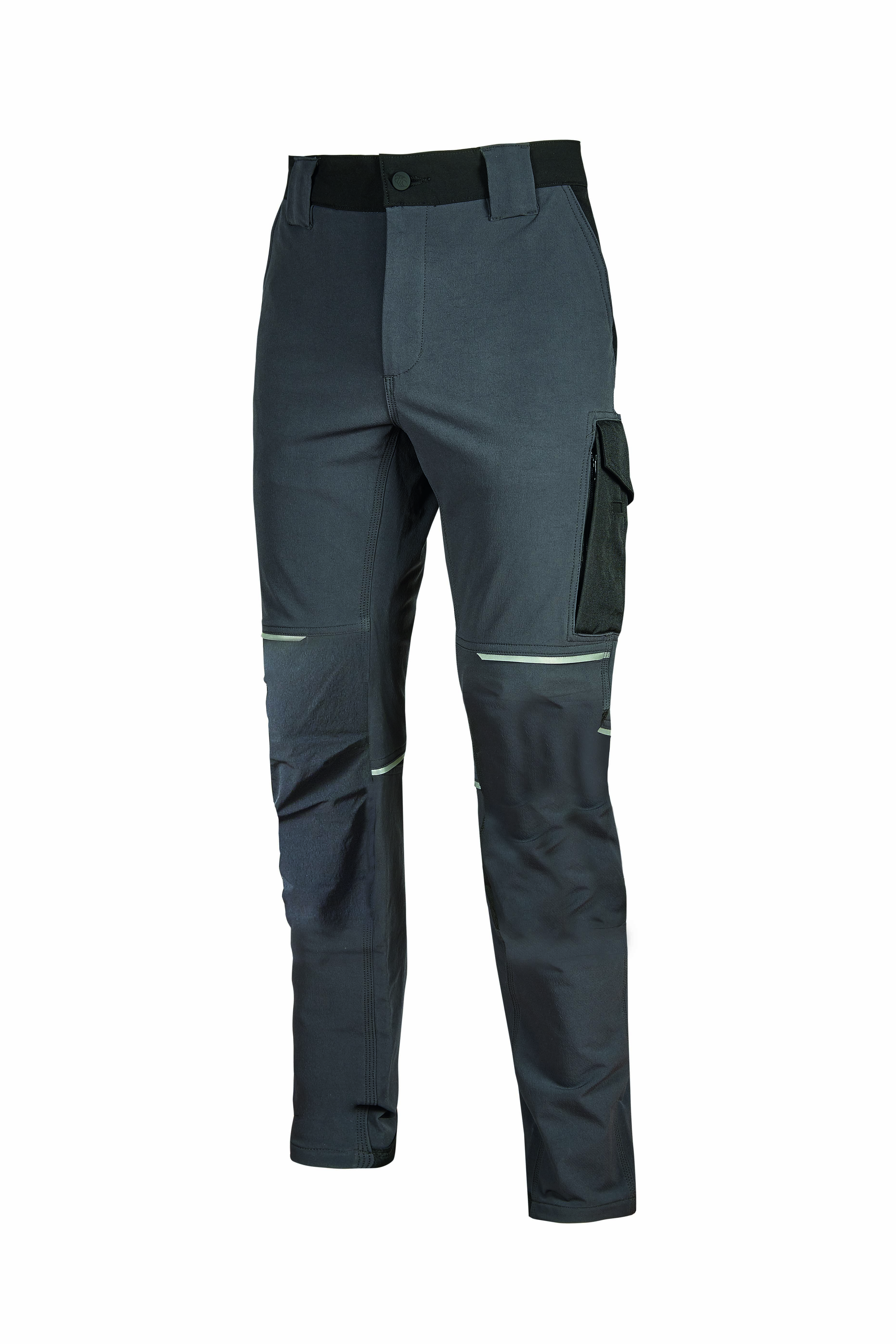 Pantalone in tessuto U-4 (U-Power 4 way stretch) molto comodo, resistente, morbido sulla pelle, idrorepellente, traspirante e asciuga rapidamente. Dotato di due ampie tasche anteriori, elastico in vita con un sistema innovativo di regolazione a scomparsa. Carrè posteriore accentuato per una maggior protezione della parte lombare e nastro re?ex su passante tubolare posteriore. Tasca laterale porta utensili, multifunzionale con porta badge a scomparsa, due tasche posteriori di cui una con pattina e una con chiusura di sicurezza a velcro, battitacco in resistente polyoxford 600D. Due tasche, chiuse con zip in corrispondenza del tascone laterale e della tasca frontale destra. Triple cuciture, bottone antigraffio, zip YKK, Slim Fit.