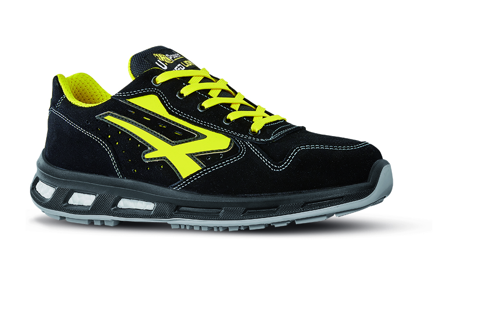 Scarpe antinfortunistiche basse, leggere e comode u power della linea Red Lion, con tomaia in morbida pelle scamosciata forata ultra traspiranti e puntale in alluminio, antiperforazione, antiscivolo e suola PU/PU infinergy S1P SRC ESD